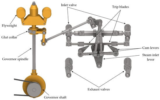 The Corliss valve gear, in addition to controlling the position of the valves to admit and exhaust steam through the connection with the crankshaft by means of inlet and exhaust coupling rods (Figure 5), is also self-regulating due to the presence of the governor. The governor’s function is to regulate speed through a linkage system that controls the position of the cams, being connected to the crankshaft by means of the drive belt and the governor shaft (Figure 6). Thus, if the invention experiences an increase in speed, due to centrifugal force, the flyweights will open, causing the dashpot spring housed within to contract, and consequently, the glut collar to rise. This causes the cam levers to reduce their vertical inclination and brake the trip blades, which are directly connected to the admission valves. The opposite occurs when it experiences a decrease in speed, causing the admission to accelerate.