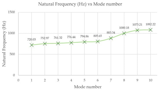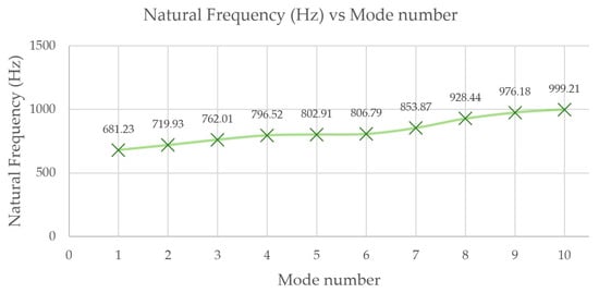 Analogously, a modal analysis was performed at critical position 2, corresponding to the bottom dead center. Figure 28 shows a graph with the results of this modal analysis, where it can be observed that the obtained results are distinct from each other and none are zero (0 Hz). Therefore, similarly to critical position 1, it is not a mechanism, and consequently, a linear static analysis can be carried out.