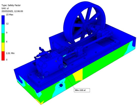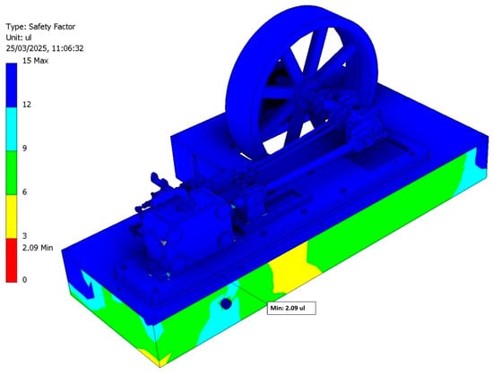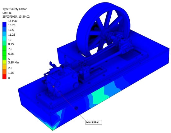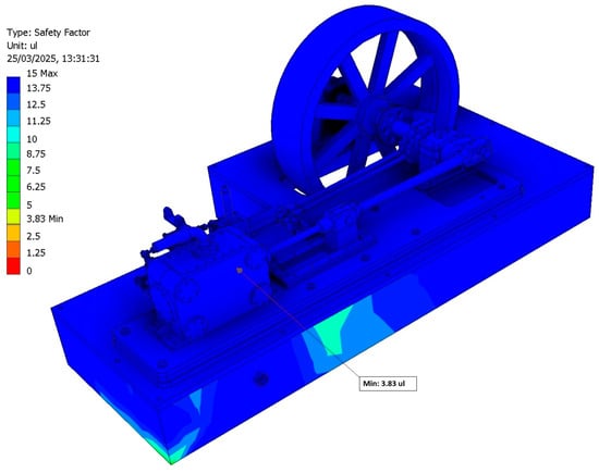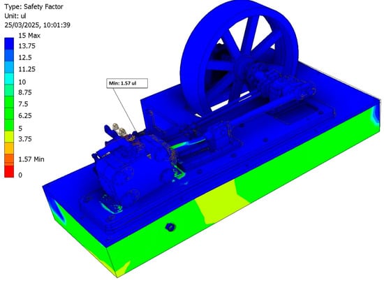 Furthermore, as the operational conditions of the invention are entirely unknown, an iterative process was necessary to determine the steam pressure at the admission (working pressure) point to enable the execution of various simulations and calculations. This iterative process was executed by modifying the working pressure at the piston’s impingement surface. The value of this pressure was based on the safety factor derived from each preceding analysis, as this factor was required to fall within the optimal design range of 2 to 4 inclusive. Consequently, the intake pressure result is deemed satisfactory if it resides within this defined range. Therefore, the maximum and minimum pressure values analyzed in this article are a direct outcome of this iterative process. Consequently, once working pressure was established, a modal analysis and a linear static analysis were performed. These analyses examined the von Mises stresses, displacements, and the safety factor, which characterize the mechanical behavior of the ensemble. This approach allowed for the verification of the invention’s design integrity under anticipated real-world operating conditions.