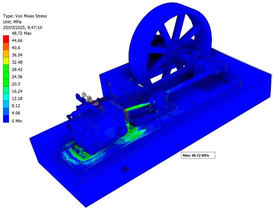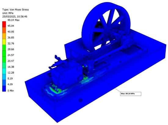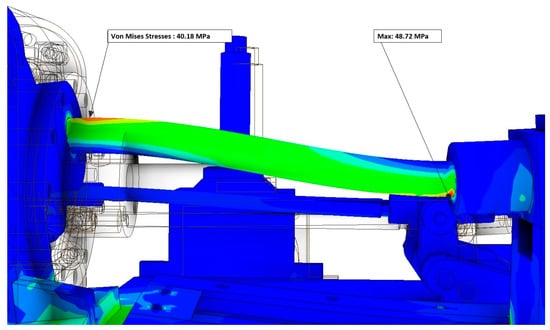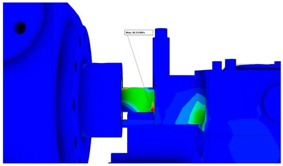 Therefore, the linear static analysis was performed for the previously defined working pressure of 7.8 MPa. Figure 23 shows the von Mises stress distribution of the ensemble, with its maximum value (49.14 MPa) located at the lower part of the piston rod, specifically at the joint with the crosshead (Figure 24).