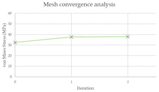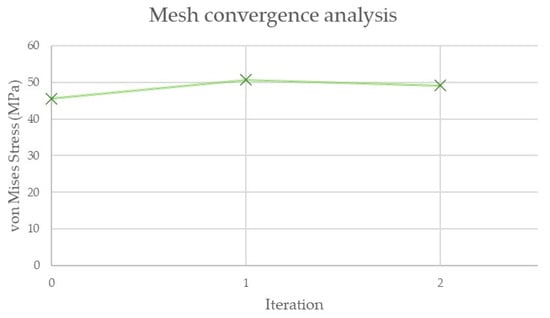 Conducting an analysis similar to that performed for critical position 1, a working pressure of 7.8 MPa has been established. Furthermore, considering that the component subjected to the highest von Mises stress is the piston rod, another mesh convergence analysis has been carried out for this case (Figure 29), the purpose of which is to obtain results that are independent of the mesh size, optimizing the balance between precision and computational cost. Table 3 shows the element size values, von Mises stress (MPa), and relative error percentage for each iteration.