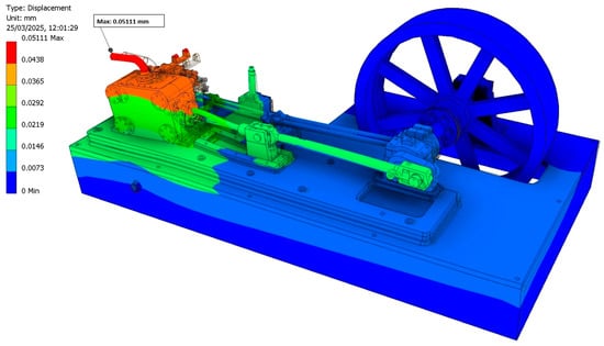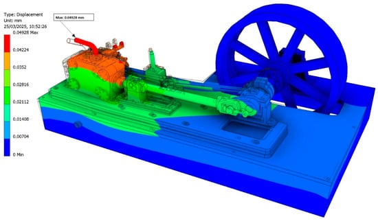 Furthermore, the displacement distribution (Figure 25) was also obtained, shown with a scale factor (×0.5) for improved visualization. Thus, analyzing the maximum obtained value of 0.04928 mm, located in the inlet steam pipe situated at the top of the cylinder block, it can be considered negligible as it is significantly smaller than the dimensions of the historical invention, considering its operation.