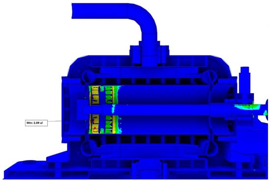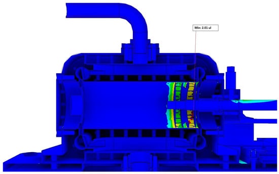 Finally, the safety factor distribution (Figure 33) and the location of its minimum value (2.01) (Figure 34) were also obtained, precisely at the cylinder liner, which is within the optimal design range.