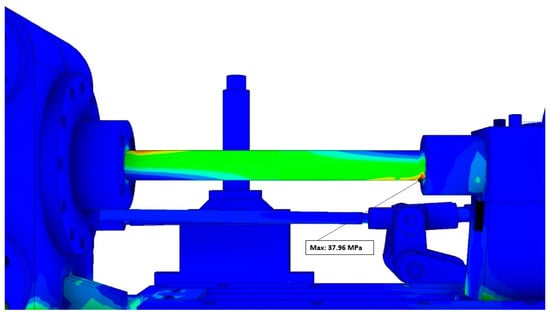 Thus, the element size applied to the piston rod was 3.8 mm, as the relative error with the previous iteration was 0.77% (less than 10%), thereby ensuring the accuracy of the simulation. Figure 30 shows the von Mises stress distribution of the ensemble, and Figure 31 shows the location of its maximum value (37.96 MPa), situated at the lower part of the piston rod at the junction with the crosshead, which is the same area obtained in the analysis of critical position 1.