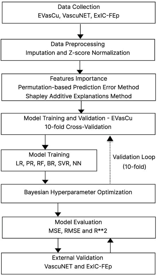 Model development followed a 10-fold cross-validation strategy on the EVasCu dataset, using Bayesian optimization to fine-tune the hyperparameters. Model performance was evaluated using standard metrics such as Mean Squared Error (MSE), Root Mean Squared Error (RMSE), and the Coefficient of Determination (). Finally, to ensure the generalizability of the models, external validation was performed using the VascuNET and ExIC-FEp datasets, thereby assessing predictive performance on unseen populations with varying cardiovascular risk profiles.