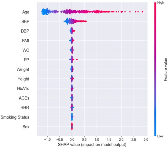 In this context, the analysis identified age, SBP, DBP, WC, weight, and height as the six most influential variables. Age and blood pressure are well-documented predictors of vascular health, reflecting their pivotal role in cardiovascular dynamics []. Indeed, it has been reported that AS and blood pressure increase with age and are independent predictors of cardiovascular events []. On the other hand, WC and weight provide crucial insights into body composition, an important factor in vascular stiffness and overall cardiovascular risk []. WC provides crucial insights into body fat distribution, which is a known factor influencing vascular stiffness and overall cardiovascular risk [].