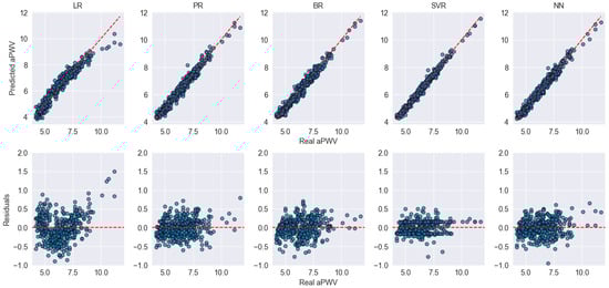 Figure 4 displays the fit and residual analysis of the different models evaluated on the VascuNET dataset. Overall, PR and NN exhibit the best performance, with predicted values closely aligned along the identity line and minimal residual dispersion. In contrast, LR, BR, and SVR show clear deviations, particularly in the upper range of aPWV values, where systematic underestimation becomes evident for aPWV values above 10 m/s. This suggests that these models struggle to accurately capture arterial stiffness in individuals with higher vascular aging. Furthermore, the residual plots confirm these trends, as LR, BR, and SVR present increasing residual magnitudes for higher aPWV values, suggesting that these models struggle to generalize well in this range. On the other hand, PR and NN maintain more homogeneously distributed residuals around zero, indicating a more stable fit across the entire range of values.