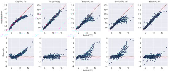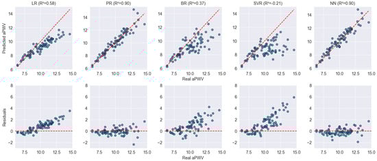 Finally, Figure 5 further confirms these findings, highlighting the impact of arterial stiffness on model performance. Since the ExIC-FEp dataset includes patients with cardiovascular disease and markedly elevated AS, most models exhibit a considerable decrease in predictive accuracy. Notably, LR, BR, and SVR show clear limitations, struggling to adapt to the high PWV values present in this population. Their predictions deviate significantly from the expected trend, leading to high residual dispersion, particularly for PWV values above 10 m/s. In contrast, PR and NN maintain robust predictive performance, with values remaining above 0.90 and residuals distributed more homogeneously around zero.