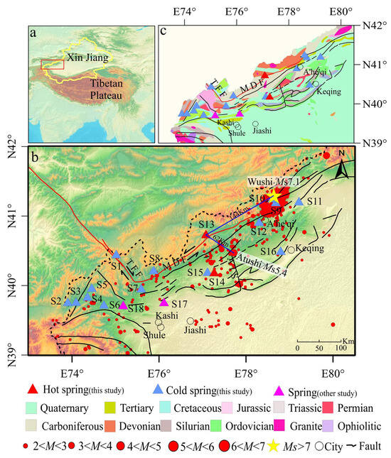 On 23 January 2024, a MS7.1 earthquake struck Wushi County, Xinjiang Uygur Autonomous Region, marking the largest seismic event in the Southern Tianshan (STS) region in the past century. This study investigates the relationship between hydrothermal fluid circulation and seismic activity by analyzing the chemical composition and origin of fluids in natural hot springs along the Maidan Fracture (MDF). Results reveal two distinct hydrochemical water types (Ca-HCO3 and Ca-Mg-Cl). The δD and δ18O values indicating spring water are influenced by atmospheric precipitation input and altitude. Circulation depths (621–3492 m) and thermal reservoir temperatures (18–90 °C) were estimated. Notably, the high 3He/4He ratios (3.71 Ra) and mantle-derived 3He content reached 46.48%, confirming that complex gas–water–rock interactions occur at fracture intersections. Continuous monitoring at site S13 (144 km from the epicenter of the Wushi MS7.1 earthquake) captured pre-and post-seismic hydrogeochemical fingerprints linked to the Wushi MS7.1 earthquake. Stress accumulation along the MDF induced permeability changes, perturbing hydrogeochemical equilibrium. At 42 days pre-Wushi MS7.1 earthquake, δ13C DIC exceeded +2σ thresholds (−2.12‰), signaling deep fracture expansion and CO2 release. By 38 days pre-Wushi MS7.1 earthquake, Na+, SO42−, and δ18O surpassed 2σ levels, reflecting hydraulic connection between deep-seated and shallow fracture networks. Ion concentrations and isotope values showed dynamic shifts during the earthquake, which revealed episodic stress transfer along fault asperities. Post-Wushi MS7.1 earthquake, fracture closure reduced deep fluid input, causing δ13C DIC to drop to −4.89‰, with ion concentrations returning to baseline within 34 days. Trace elements such as Be and Sr exhibited anomalies 12 days before the Wushi MS7.1 earthquake, while elements like Li, B, and Rb showed anomalies 24 days after the Wushi MS7.1 earthquake. Hydrochemical monitoring of hot springs captures such critical stress-induced signals, offering vital insights for earthquake forecasting in tectonically active regions.