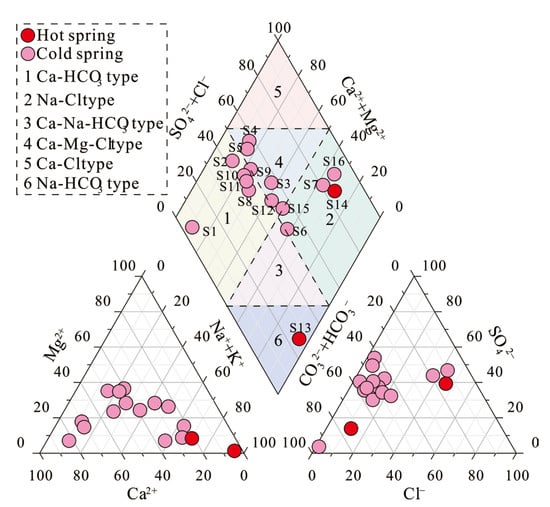 Piper diagram analysis indicates that cold springs in the study area are predominantly enriched in Ca2+ and Mg2+, with Ca2⁺ being the dominant cation. Only the thermal springs S13 and S14, along with cold springs S6, S7, and S16, fall within the Na+ and K+ enriched zones (Figure 2), indicating the presence cation exchange processes. These cold springs are mainly of the Ca-HCO3 and Ca-Mg-Cl types, typically reflecting interactions with carbonate lithologies or contributions from young, recently recharged groundwater. Elevated Ca2+ concentrations likely result from carbonate mineral dissolution, releasing Ca2+ and HCO3− and forming Ca-HCO3 type waters. Mg2+ enrichment may arise from geochemical reactions with dolomite [CaMg(CO3)2] or other Mg-rich carbonates.