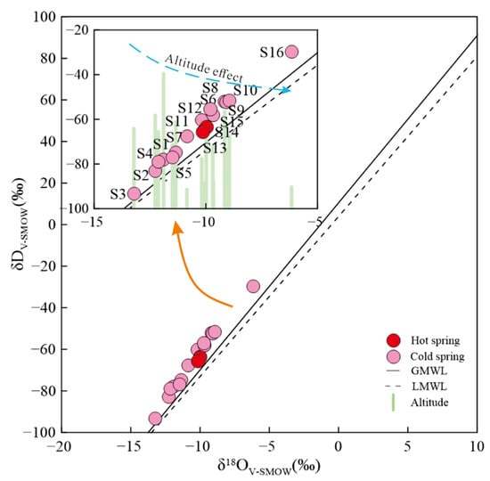 The δ18O–δD relationship shows that local meteoric water plots below the Global Meteoric Water Line (GMWL) likely reflect evaporative enrichment due to the region’s arid climate and continental interior location. Atmospheric moisture is primarily derived from westerly circulation with significant contributions from local evaporative recycling [58]. Most groundwater samples plot to the left of both the global and local meteoric lines, suggesting recharge primarily from meteoric precipitation with potential inputs from glacial meltwater or fracture-zone derived deep groundwater [57]. The δ-values of hot springs S13 and S14 fall closer to the local meteoric line, indicating deeper circulation and isotopic homogenization due to prolonged subsurface residence and geothermal heating. In contrast, the shallower cold springs exhibit more depleted isotope values consistent with rapid recharge and minimal interaction. Isotope values increase with decreasing elevation (Figure 3), likely due to altitude-driven isotope fractionation. Oxygen drift is accounted for, and groundwater recharge elevation (H) is determined using δD-elevation relationships.