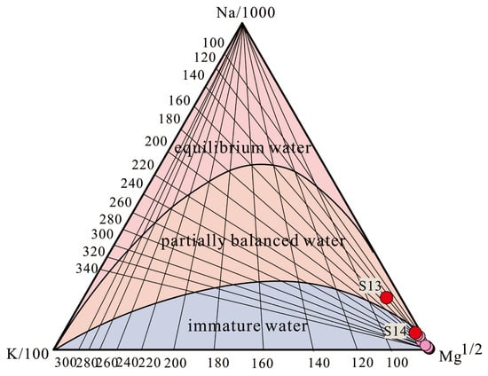 The Na-K-Mg triangulation is a useful tool for assessing the reaction time and chemical maturity of geothermal fluids during water–rock interaction [70]. As shown in Figure 4, sample S13 falls within the partial equilibrium zone, and S14 lies near this boundary, indicating ongoing but incomplete water–rock equilibration. All remaining samples are immature, implying limited residence times and shallow circulation systems. Magnesium is a sensitive indicator in this diagram, as it is rapidly removed in mature geothermal systems. Elevated Mg2⁺ concentrations in S13 and S14 imply short fluid–rock interaction periods and low chemical maturity. This suggests limited hydraulic connectivity to deep reservoirs and supports classification as an intermediate geothermal system. Cold springs show uniformly immature signatures, indicative of shallow meteoric recharge and minimal subsurface interaction.