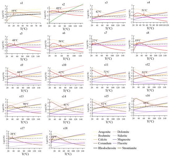 Variation pattern of reservoir mineral saturation index (log (Q/K)) with temperature.
