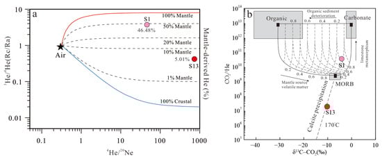 In natural environment, tritium (3He) is a primordial isotope, while deuterium (4He) predominantly originates from the radioactive decay of uranium (U) and thorium (Th). The 3He/4He ratio serves as a tracer for helium sources: mantle-derived helium (1.1 × 10−5 to 1.4 × 10−5), crustal helium (2 × 10−8), and atmospheric helium (1.39 × 10−6) [22,64]. The mantle helium percentage is estimated using the atmospheric correction (Rc/Ra) derived from the observed 3He/4He values. The combined analysis of 3He/4He and 4He/20Ne ratios provides insights into helium origin and atmospheric mixing (Figure 6a). Sample S1 exhibits 46.48% mantle-derived helium, indicating significant interaction with deep-sourced gases during ascent. This is likely driven by active tectonism or geothermal flux that facilitates mantle gas migration along fault conduits. Conversely, S13 contains only 5.01% mantle helium, indicating limited deep gas interaction. Instead, S13 helium primarily derives from U-Th decay, indicating stronger crustal influence. This implies a relatively quiescent tectonic environment, or alternatively, enhanced trapping of radiogenic helium with shallow fracture networks.