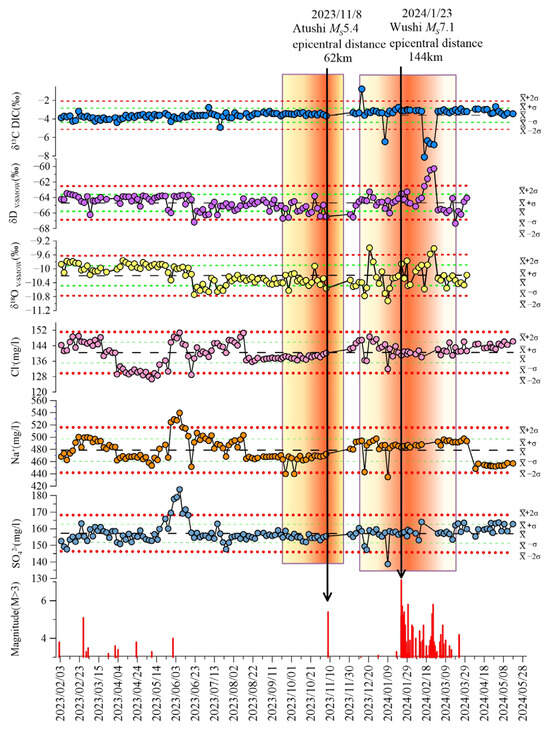 Hydrochemical anomaly thresholds were established using time-series monitoring data from the S13 spring. Here, the background concentrations were defined by the mean values, while anomalous levels were determined using ±2σ (standard deviation) thresholds. The mean concentration of Na+ is 466.73 mg/L, Cl− is 137.67 mg/L and SO42− is 155.42 mg/L. The mean value of δ18O is −10.20‰, δD is −64.70‰, and δ13C DIC is −3.60‰. The mean concentrations of 13 trace elements (Li, B, Al, Ba, Ge, Rb, Cs, V, Be, Mo, Cr, Sr, and Sb) in spring water is 688.57, 4987.94, 32.47, 91.29, 19.21, 26.37, 45.60, 0.07, 0.03, 0.17, 0.18, 480.28, and 0.05 μg/L. More detailed information can be seen in Tables S2 and S3.
