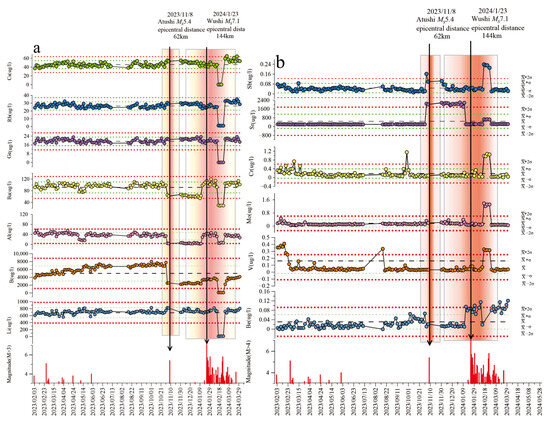 Long-term monitoring of trace elements concentration changes at S13 hot springs and the magnitude and date of M > 3.0 earthquakes in related tectonic regions. (a) Li, B, Al, Ba, Ge, Rb, and Cs concentrations, (b) Be, V, Mo, Cr, Sr, and Sb concentrations.
