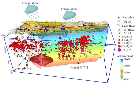 A conceptual model (Figure 10) of fluid circulation in the STS region is proposed, constructed based on regional topography and geological settings (Figure 1). Geothermal waters are primarily recharged by atmospheric precipitation from the Tianshan Mountains. As these waters percolate through the subsurface, dissolution of reservoir mineral enriches the geothermal fluids with various chemical components. The migration of deep fluids is governed by the spatial configuration and activity of fault systems, regional stress fields, and rock permeability, all of which are influenced by the uplift of the STS Mountains and the subsidence of the Tarim Basin. Seismological and geophysical investigations [54,55,72,73,74] have identified a mid-crustal low-velocity, high-conductivity anomaly beneath the Tianshan orogen, suggesting the upward migration of mantle-derived fluids ascend through faults and discharge at the surface as thermal springs, indicating that mantle materials are transported to the crust via fault-facilitated pathways and ultimately released as geothermal discharges. Meteoric water infiltrates and circulates within deep reservoirs characterized by high geothermal gradients. It subsequently ascends along fault networks and mixes with shallow, colder groundwater within near-surface faults systems. This vertical fluid migration facilitates geothermal energy releases, drives extensive water–rock interactions, and alter both chemical and isotopic composition of the circulating fluids. The interplay between deep fluid upwelling and shallow mixing processes governs geothermal activity in the southern Tianshan region. This model provides insights into the regional tectonic-hydrothermal framework and serves as a foundation for hydrogeological and geothermal resource assessments. Continued multidisciplinary investigations are essential for evaluating the feasibility of geothermal exploitation and improving the predictive capacity for seismically induced hydrogeochemical responses.