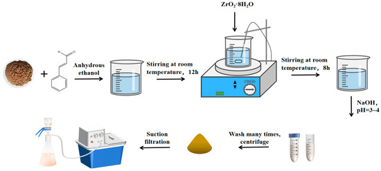 A mass of 0.5 g of 200-mesh MS powder was accurately weighed and placed in a beaker. Then, 15 mL of absolute ethanol and 10 μL of CID solution were added, and the mixture was stirred at room temperature for 12 h. Subsequently, 0.3, 0.6, and 0.9 g of ZrOCl2·8H2O powder were weighed and respectively added into the mixed solution under stirring for 12 h to create three mixtures. Each mixture was then stirred at room temperature for an additional 8 h. After the reaction, the pH of the mixed solution was adjusted to 3.5–4.0 using 0.1 M NaOH solution. The mixed solution was centrifuged at 12,000 rpm for 5 min to take the lower precipitate, which was then dried at 60 °C for 12 h. The samples MS/CID/ZrO2-0.3, MS/CID/ZrO2-0.6, and MS/CID/ZrO2-0.9 were obtained, respectively.