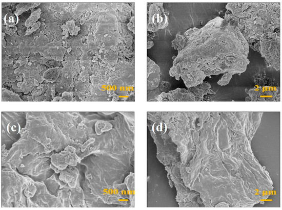 To better observe the microstructure of the MS/CID/ZrO2 composites, we analyzed MS and MS/CID/ZrO2 using SEM, and the results are shown in Figure 2. Figure 2a,b display the SEM images of MS, revealing a rough surface structure characterized by layered and stacked granular features. In contrast, Figure 2c,d present the SEM images of MS/CID/ZrO2, which exhibits a smoother surface structure. Adjusting the pH to between 3.5 and 4.0 during the solution preparation process is conducive to the formation of very small ZrO2 nanoparticles (approximately 5–20 nm) [25,26]. We suggest that this smoother surface resulted from the addition of ZrOCl2·8H2O, where the in situ-generated biomimetic ZrO2 nanoparticles filled the original pores in MS.