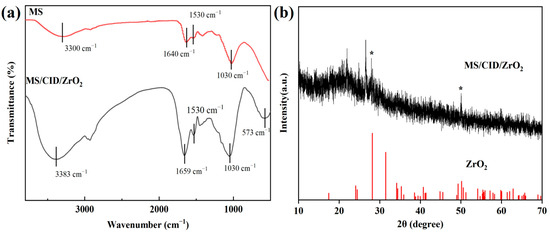 (a) FTIR spectra of MS and MS/CID/ZrO2 composites. (b) XRD pattern of MS/CID/ZrO2 composites (☆ the marked peak is characteristic of ZrO2, the red line represents the ZrO2 standard card).