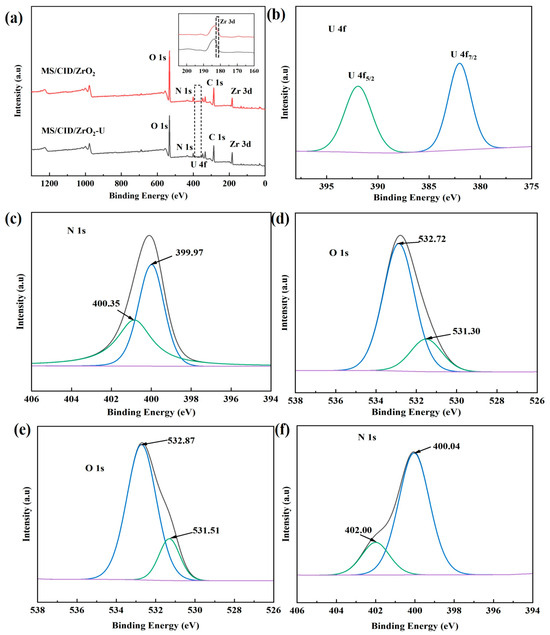 The O 1s and N 1s peaks of the MS/CID/ZrO2 composites before and after the U(VI) adsorption were analyzed, and the results are shown in Figure 4c,e and Figure 4d,f, respectively. The high-resolution N 1s spectrum of the sample before the uranium adsorption was deconvoluted into two peaks at 399.97 and 400.35 eV, corresponding to C-NH2 and C=N-OH [37], respectively. After the U(VI) adsorption, the N 1s spectrum shifted to higher binding energies (400.04 and 402.00 eV). This shift can be attributed to the formation of coordination bonds between the lone pair electrons of nitrogen atoms and uranium, which reduced the electron density around the N atoms and increased their binding energy [38,39]. Similarly, as shown in Figure 4d, the high-resolution O 1s spectrum of the sample before the uranium adsorption was deconvoluted into two peaks at 531.30 and 532.72 eV, corresponding to -COOH and -OH groups in MS/CID/ZrO2, respectively. After the adsorption, the positions of these peaks shifted to 531.51 and 532.87 eV, respectively. This shift, similar to the case for N atoms, indicates that O atoms also participated in the coordination with uranium. From the inset of Figure 4a, it can be seen that after adsorption, the Zr 3d peak of MS/CID/ZrO2 shifted to the direction of higher binding energy, which may be due to the participation of F−- and Zr(IV)-bonded hydroxyl groups in the adsorption reaction, resulting in the formation of new zirconium species (Zr oxyfluoride or ZrF4) [40,41].