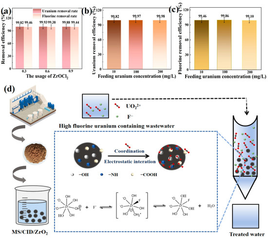 To further investigate the removal efficiency of the MS/CID/ZrO2 composites in high-fluoride uranium-containing solutions, we tested simulated wastewater solutions with varying uranium concentrations (10, 100, and 200 mg/L) and a constant F− concentration of 100 mg/L. As shown in Figure 5b, when the U(VI) concentration was 10 mg/L, the removal efficiency of MS/CID/ZrO2-0.3 for U(VI) reached 99.82%. At the U(VI) concentrations of 100 and 200 mg/L, the removal efficiency increased to 99.97% and 99.98%, respectively. Similarly, the F− removal efficiency of the MS/CID/ZrO2-0.3 exceeded 99% for all tested uranium concentrations (Figure 5c). The removal efficiency of MS for F− in high-fluorine uranium-containing wastewater was poor, about 70% (Figure S1). In order to evaluate the saturated adsorption performance of the MS/CID/ZrO2, the MS/CID/ZrO2 sample was dried, and 0.1 g of MS/CID/ZrO2 was mixed with 500 mL of high-fluorine uranium-containing wastewater (U(VI) and F− concentrations: 100 mg/L). The results showed that the adsorption capacity of the MS/CID/ZrO2 for U(VI) was 310.60 mg/g, and the saturated capacity for F− was 107.98 mg/L. The adsorption of U(VI) and F− by the MS/CID/ZrO2 can be attributed to the interactions between surface functional groups, such as hydroxyl (-OH), Zr-OH, -NH, and -NH2, and U(VI). These groups exhibited electrostatic attraction and complexation with U(VI), and their active sites demonstrated high adsorption capacity for various uranium hydrolysis products, based on previous reports [43,44].