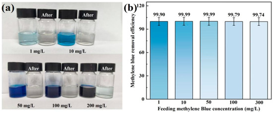 To further investigate the removal efficiency of MS/CID/ZrO2 towards MB, we prepared simulated wastewater solutions with varying MB concentrations (1, 10, 50, 100, and 300 mg/L). After the adsorption by MS/CID/ZrO2, a significant color change was observed, with the treated water becoming nearly transparent (Figure 6a). Then, we calculated the removal efficiency of the hybrid adsorbent. When the concentrations of the MB solutions were 1, 10, 50, 100, and 300 mg/L, the removal efficiency was 99.90%, 99.99%, 99.99%, 99.79%, and 99.74%, respectively (Figure 6b), which proves the excellent removal efficiency of the MS/CID/ZrO2 towards MB. The removal efficiency of MB by MS is relatively poor, especially at low concentrations (Figure S2). In order to evaluate the saturated adsorption performance of MS/CID/ZrO2 on MB, the MS/CID/ZrO2 sample was dried, and 0.1 g of MS/CID/ZrO2 was mixed with 250 mL of MB solution with a concentration of 50 mg/L. The results showed that the adsorption capacity of MS/CID/ZrO2 for MB was 100.55 mg/g.