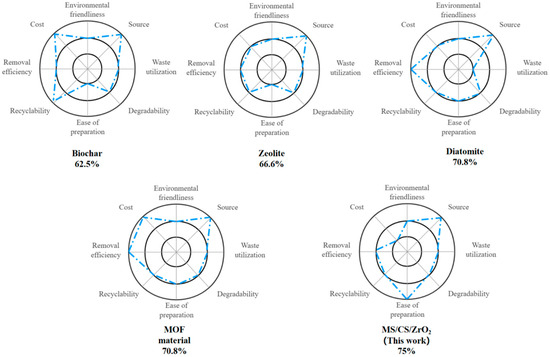 We chose four previously published materials, including biochar, zeolite, diatomaceous earth, and metal–organic frameworks, to compare with MS/CID/ZrO2 to study their sustainability. According to Formula (2) above, they correspond to sustainability values of 62.5%, 66.6%, 70.8%, 70.8%, and 75%, respectively, as shown in Figure 8. It can be found that the MS/CID/ZrO2 reveals relative advantages in terms of cost, source, and ease of preparation. The production of MS increases dramatically every year, providing a continuous supply of raw materials for the preparation of MS/CID/ZrO2. Due to its simple preparation process, it offers distinct advantages as an adsorbent for water treatment applications.
