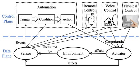 Modern smart homes support multiple control methods, including remote, voice, physical, and automated control. Remote control is typically performed through a mobile companion app that enables the configuration and management of smart devices. Voice control allows users to issue commands via smart speakers (e.g., Amazon Echo Dot) or smartphone voice assistants (e.g., Google Assistant). These commands are interpreted by the platform and sent to the relevant devices for execution. Physical control involves direct interaction with devices, such as pressing buttons or using touchscreens. Automation in smart homes offers a personalized and intelligent approach to responsive control. Users configure automation rules by installing applications on the platform, with each application capable of defining one or more rules. These rules follow a “trigger–condition–action” programming paradigm.
