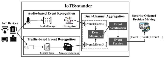 Due to the heterogeneity of the channels, recognized events in smart homes may vary in categories, coverage, and precision, often resulting in overlaps, as illustrated in Figure 6. To enable comprehensive and accurate monitoring, this section introduces a dual-channel aggregation mechanism that merges event sequences from audio and traffic channels, addressing the heterogeneity and improving the overall accuracy of event recognition. We provide a detailed explanation of the decision fusion mechanism employed by IoTBystander, which is essential for enhancing its scalability and flexibility. By aggregating outputs from multiple independent monitoring channels, IoTBystander leverages complementary insights from diverse data sources, improving the system’s reliability and robustness and ensuring more consistent and precise event detection.
