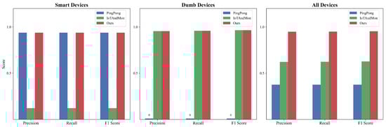 We establish a real-world testbed that includes nine types of smart devices, as shown in Table 6 and Figure 7, and eleven types of dumb devices: microwave, range hood, clock, mouse, keyboard, vacuum cleaner, faucet, toilet, washing machine, doorbell, and gas stove.