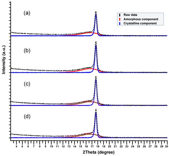 X-ray diffraction patterns with deconvoluted amorphous and crystalline components: (a) FEP-1; (b) FEP-2; (c) FEP-3; (d) FEP-4.