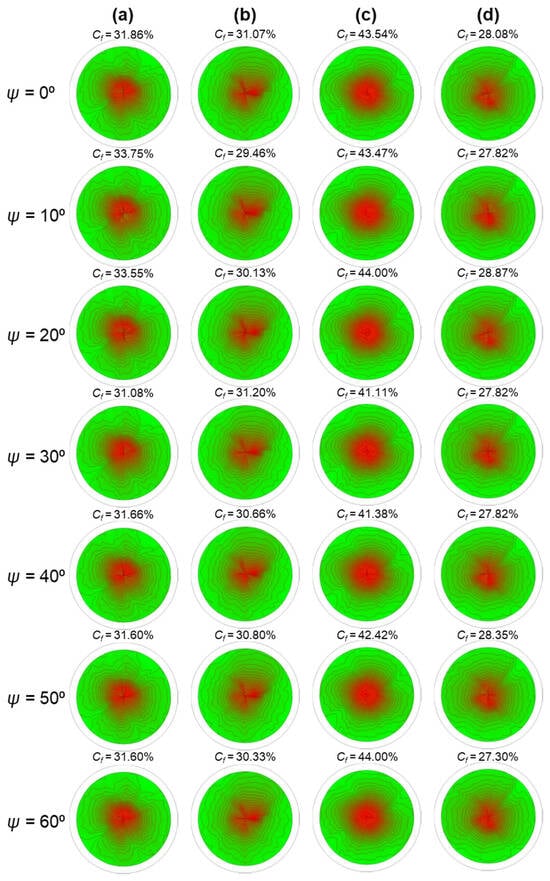 To reveal the polymer chain reorganization in the FEP structure, the macromolecular orientation texture analysis was performed employing XRD via the pole figure measurements. The intensity of 2θ maxima of the crystalline component was measured by moving the sample through ψ (tilt) azimuth angle and φ (spindle) polar rotations and plotting the measured intensities in the hemisphere-like distribution of scattered intensity via orthographic projection on a pole figure. Figure 2 shows the calculated pole figures for the reflexes of the crystalline components of FEP-1, FEP-2, FEP-3, and FEP-4.