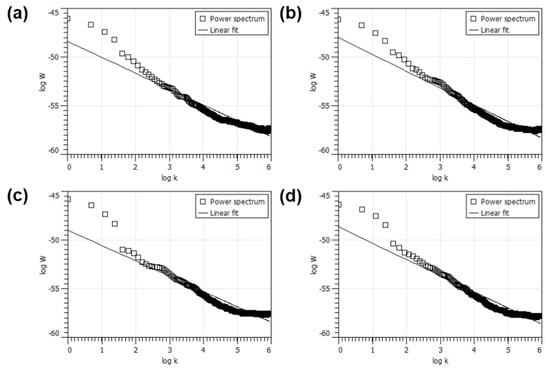 It can be clearly seen that the FEP treatment processes significantly affected the structural properties of the polymer, producing different crystalline morphologies. Through the intensity distribution analysis based on k-means clustering, the values of the crystalline fraction (denoted as Cf) were refined and displayed with each pole figure, respectively. To quantitatively estimate the degree of anisotropy from the calculated pole figures, the power spectrum method was employed for the determination of the fractal dimension (Df). This method is based on the power spectrum dependence of the fractional Brownian motion. Every line intensity profile that forms the pole figure underwent Fourier transform analysis, and the power spectrum was evaluated and averaged. The fractal dimension was calculated from the slope β of a least-square regression line fit to the data points in the log–log plot of the power spectrum as Df = 7/2 − β/2. In general, Df directly correlates with the degree of anisotropy: the lower the Df, the higher the anisotropy.