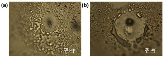 The optical microscope images of nanosecond pulsed laser treatment of the FEP polymer: (a) virgin and (b) heat-treated. Laser parameters: τp ~10 ns, λ = 355 nm and frep ≈ 20 kHz, N = 100 pulses per spot, pulse energy Ep = 50 μJ.