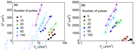 Taking into account Equation (1) with the various pulse energy values, an ablation threshold fluence Fth is obtained from a semi-logarithmic plot of the diameter squared of the ablated area D2 versus peak laser fluence F0. The slope of the straight lines provides the Gaussian beam radius w0. Figure 5 shows experimental results of the squared diameters D2 of ablated areas versus laser fluence F0 for laser-processed FEP polymers considering a different number of pulses per spot (N = 5, 10, 20, 30, 50, and 100).
