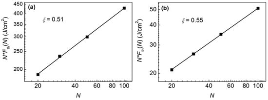 The ablation threshold values decreased with an increase in the number of pulses. The threshold values were lower for the heat-treated FEP polymer by a factor of ~10. Figure 6 shows a graph of the accumulated laser fluence N × Fth(N) versus the number of pulses N for the FEP polymer.