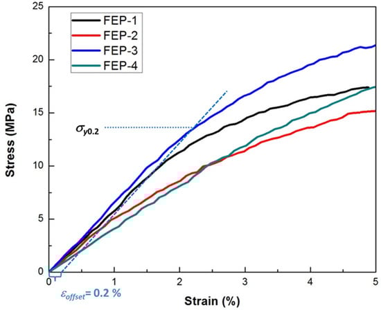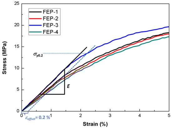 Virgin (FEP-1) as well as heat (FEP-2)-, UV light (FEP-3)-, and heat–UV (FEP-4)-treated 25 μm thick FEP polymer samples of two different rolling directions were tested in the microtensile setup to determine Young’s modulus E (slope of the tangent to the stress–strain curve) and yield stress σy0.2 (at 0.2% of strain ε). The average stress–strain curves for each FEP sample cut in parallel and perpendicular to the roll direction of the polymer are presented in Figure 7 and Figure 8, respectively. The characteristic solid tangential line represents the determination of Young’s modulus for the UV light-affected sample. The intersection of the dashed line with the experimental curve at a 0.2% strain offset provides the yield stress (σy0.2).