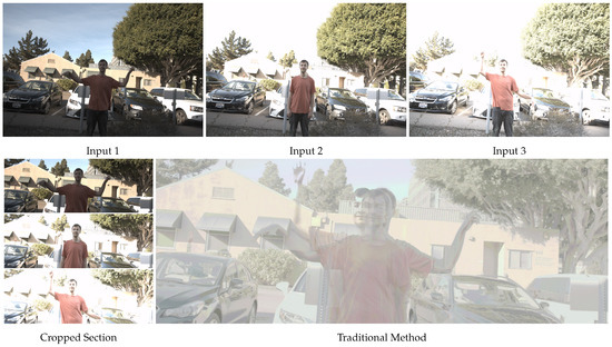 However, traditional HDR image reconstruction methods such as those of Debevec et al. [7] have encountered challenges in generating high-quality HDR images when there is movement in the scene, due to occlusion of certain areas and misalignment between the images. In Figure 1, the reconstruction performed using this traditional method from three inputs with motion is illustrated [7]. It becomes possible to observe that traditional methods can generate images that exhibit artifacts such as ghosts and blurs, which are characterized as the partial appearance of an element that was in motion, either due to the camera or the time interval between the input images. Ghosts are related to large movements, while blurs are related to minor movements [8,9].