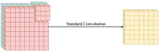 This section is based on [37,38]. Figure 3 illustrates the process of standard convolution, which performs spatial-wise and channel-wise computation in a single step. In this process, a kernel is applied simultaneously over the height, width, and channel dimensions of the image.