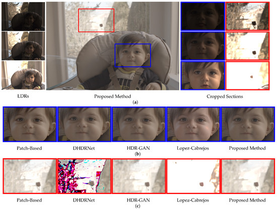 The structure of the scene presentation is composed of three different input exposures (LDRs), the image reconstructed by the proposed model, cutouts of the input regions that will be analyzed, and the comparison between the models. Therefore, Figure 7 shows an analysis of the HighChair scene from the Sen et al. dataset, chosen due to its characteristics of slight movements, as indicated in the blue rectangle, and saturated background in the red rectangle, as can be seen in Figure 7a. All models obtained excellent results in the alignment performed in the Cropped Section Figure 7b, demonstrating that the magnitude of movement in this scene was not challenging. Meanwhile, in the Cropped Section Figure 7c, all models reconstructed a smooth background, with the exception of DHDRNet [10] and Lopez-Cabrejos [49], which exhibited artifacts at the image saturation level or oversaturation.
