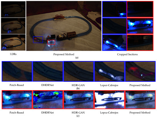 Figure 8 illustrates the analysis of the scene Toytrain of the Tursun et al. [27] dataset, representing low-light conditions and large movements, as shown in detail in Figure 8a. In the Cropped Section Figure 8b shown in the blue rectangle, the Patch-Based [26] model, Lopez-Cabrejos [49] model, and the proposed model presented artifacts in dark scenes, possibly due to the [10] dataset used for training, which contains mostly bright scenes [28]. This suggests that dataset diversification, including different lighting conditions, is essential for models with a low number of parameters. However, the proposed model demonstrated good performance in the reconstruction of large movements in the Cropped Section Figure 8c, highlighted by the red rectangle, while DHDRNet [10] generated light artifacts and the Lopez-Cabrejos model [49] produced a reconstruction of this region with excessive brightness, leading to loss of information.