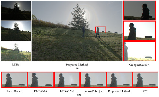 Using scene 21-1 from the Tel et al. [28] dataset, presented in Figure 9, containing features of high background saturation and large movement, challenging situations are demonstrated, as can be seen in Figure 9a. In the analyzed area of the red rectangle, in the Cropped Section Figure 9b, the proposed model demonstrated a smooth background and avoided artifacts caused by movement. Unlike this, the HDR-GAN [16] model presented ghosting in this area.