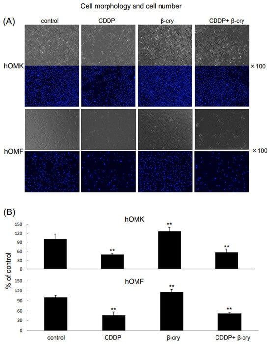 Changes in morphologies and numbers of hOMK and hOMF after the CDDP treatment. (A) Morphologies of hOMK and hOMF in each group. Magnification ×100. (B) The numbers of CDDP-treated hOMK and hOMF were significantly lower than those of control cells, whereas those of β-cry-treated hOMK and hOMF were significantly higher. Values are means ± S.D. n = 6 (sample number in each group) ** p < 0.01 vs. control.