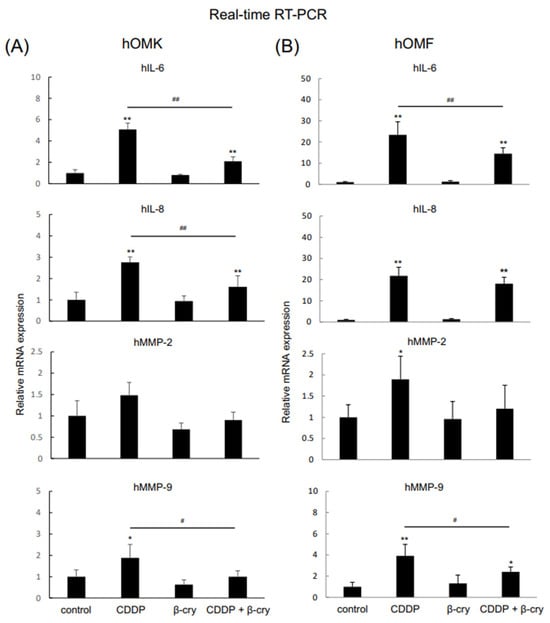 Effects of CDDP and β-cry on inflammatory cytokine and MMP mRNA expression levels in hOMK and hOMF. IL-6, IL-8, and MMP-9 mRNA expression levels were significantly higher in CDDP-treated hOMK (A) and hOMF (B) than in control cells. IL-6, IL-8, and MMP-9 mRNA expression levels were significantly lower in CDDP+β-cry-treated hOMK than in CDDP-treated hOMK (A). IL-6 and MMP-9 mRNA expression levels were significantly lower in CDDP+β-cry-treated hOMF than in CDDP-treated hOMF (B). Values are means ± S.D. n = 4 * p < 0.05, ** p < 0.01 vs. control, # p < 0.05, ## p < 0.01 between each group.