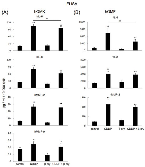 hOMK and hOMF were seeded at a cell density of 3 × 104 cells/well on 24-well plates. After 24 h, these cells were stimulated with CDDP (1 µg/mL) and β-cry (1 × 10−7 M). Seven days later, the culture supernatant was collected, and an ELISA kit (R&D Systems, Minneapolis, MN, USA) was used to assess the production of cytokines (IL-6 and IL-8) and MMPs (MMP-2 and MMP-9). A microplate reader (Emax®, Molecular Devices, Sunnyvale, CA, USA) was employed to measure absorbance at 450 to 650 nm. Cytokine and MMP levels in each sample were then calculated from standard curves.