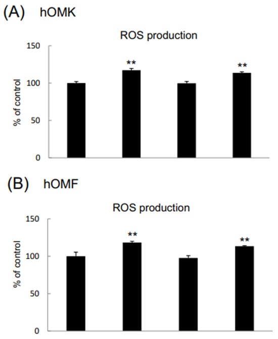 Effects of CDDP and β-cry on ROS levels in hOMK and hOMF. ROS levels were significantly higher in CDDP-treated hOMK (A) and hOMF (B) and in CDDP+β-cry-treated hOMK and hOMF than in control cells. Values are means ± S.D. n = 4, ** p < 0.01 vs. control.