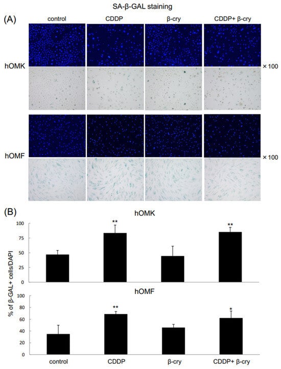 Effects of CDDP and β-cry on cellular senescence in hOMK and hOMF. (A) Images for β-GAL staining and DAPI of hOMK and hOMF in each group. Magnification ×100. (B) The percentages of β-GAL-positive cells were significantly higher in CDDP-treated hOMK and hOMF and in CDDP+β-cry-treated hOMK and hOMF than in control cells. Values are means ± S.D. n = 4 * p < 0.05, ** p < 0.01 vs. control.