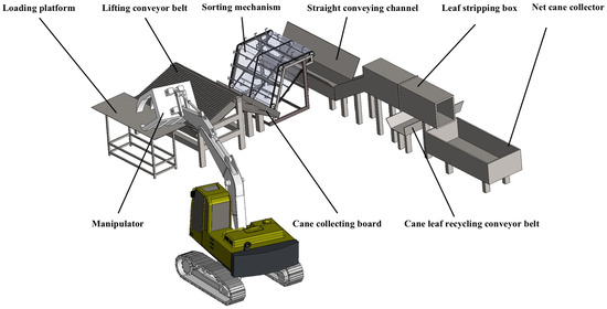 One of the world’s major cash crops for energy and sugar is sugarcane [1]. One of the world’s leading producers of sugarcane is in China [2], while the majority of China’s sugarcane-growing regions are located in Guangxi, Yunnan, Guangdong, and other provinces. The degree of mechanization of sugarcane harvesting in China is less than 5% [3], due to the country’s diverse terrain and lack of standardized standards for sugarcane cultivation. Sugarcane leaf stripping is an essential aspect of sugarcane harvesting, affecting the economic advantages of harvesting and sugar production for sugarcane farmers [4], and it is critical to create leaf stripping technology that is appropriate for China’s planting circumstances. Currently, sugarcane leaf stripping equipment primarily serves as a supporting part of the sugarcane combine harvester, which can perform both harvesting and leaf stripping simultaneously. However, the combine harvester’s leaf stripping [5,6] has a high impurity rate, is prone to clogging, and has an unstable operating performance. Therefore, Guangxi University proposed a step-by-step method for harvesting sugarcane that involves harvesting, transferring, and centralizing the leaf stripping of crops independently. This method can be used on small terrain, like hills and mountains, and has the advantages of being highly flexible, having a low rate of impurity during the leaf stripping process, and matching the sugar mill process in comparison to the cut-off type [7] and the whole culm type combine harvester.