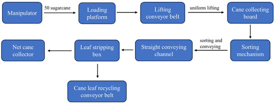 The overall structure of the step-by-step sugarcane leaf stripping equipment is shown in Figure 1. Its primary components are a loading platform, a manipulator, a lifting conveyor belt, a cane collecting board, a sorting mechanism, a straight conveying channel, a leaf stripping box, a cane leaf recycling conveyor belt, a net cane collector, and additional mechanisms. The equipment works as follows: the manipulator picks up roughly fifty sugarcane stalks each time and distributes them between the loading platform and the lifting conveyor belt. The lifting conveyor belt then raises the stack of canes at a steady pace, and once it reaches the top of the conveyor belt, the sugarcane falls to the cane collection board. From there, they slide to the bottom of the cane collection board, where they are sorted by the sorting organization and moved for conveying. The sugarcane is conveyed in a sorting device to maintain its lateral state. The pull-type leaf stripping machine requires that the cane tail be fed first. The straight conveying channel and the sorting mechanism have a vertical layout. The cane changes direction and feeds into the leaf stripping box through the straight conveying channel. The process of stripping the sugarcane is finished once it enters the net cane collector. When the cane reaches a certain weight, the collector baffle plate will automatically open the sugarcane bundling loading trucks to finish the sugarcane leaf stripping operation. The sugarcane defoliation procedure has finished. Figure 2 displays the operation flow chart.